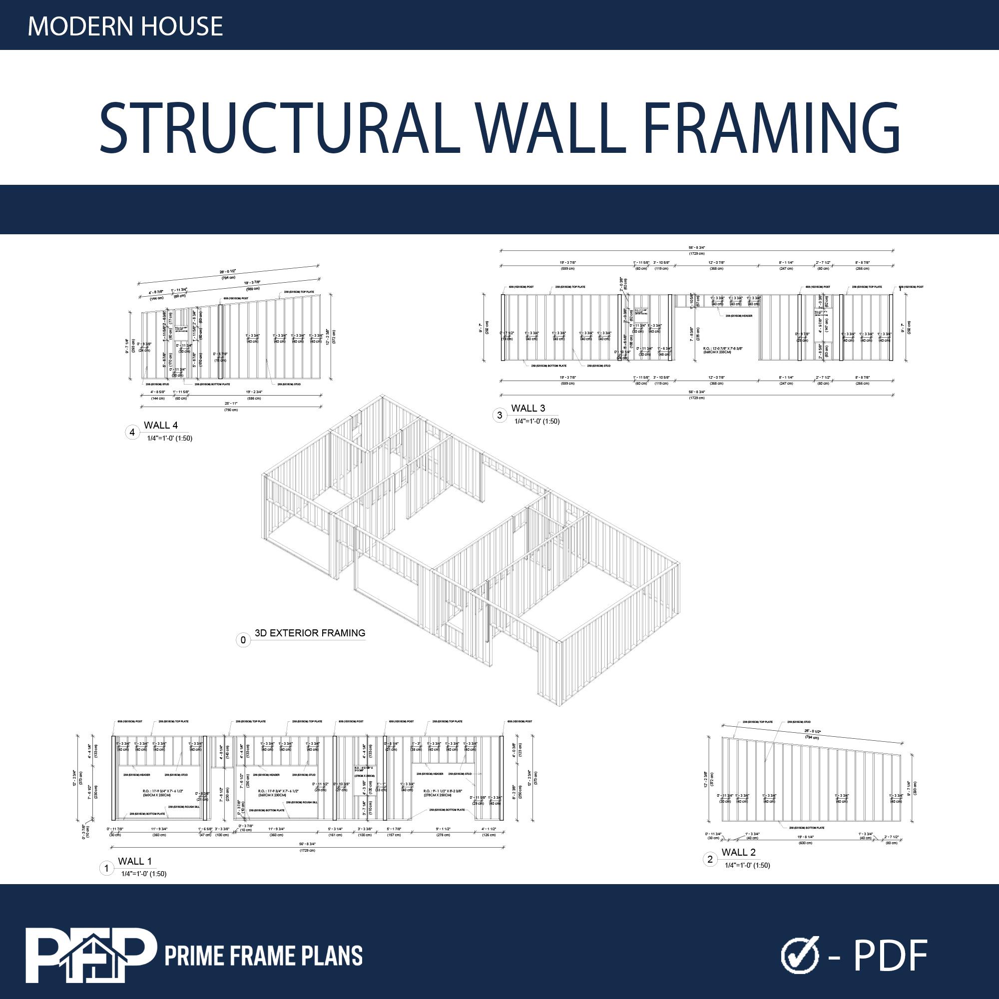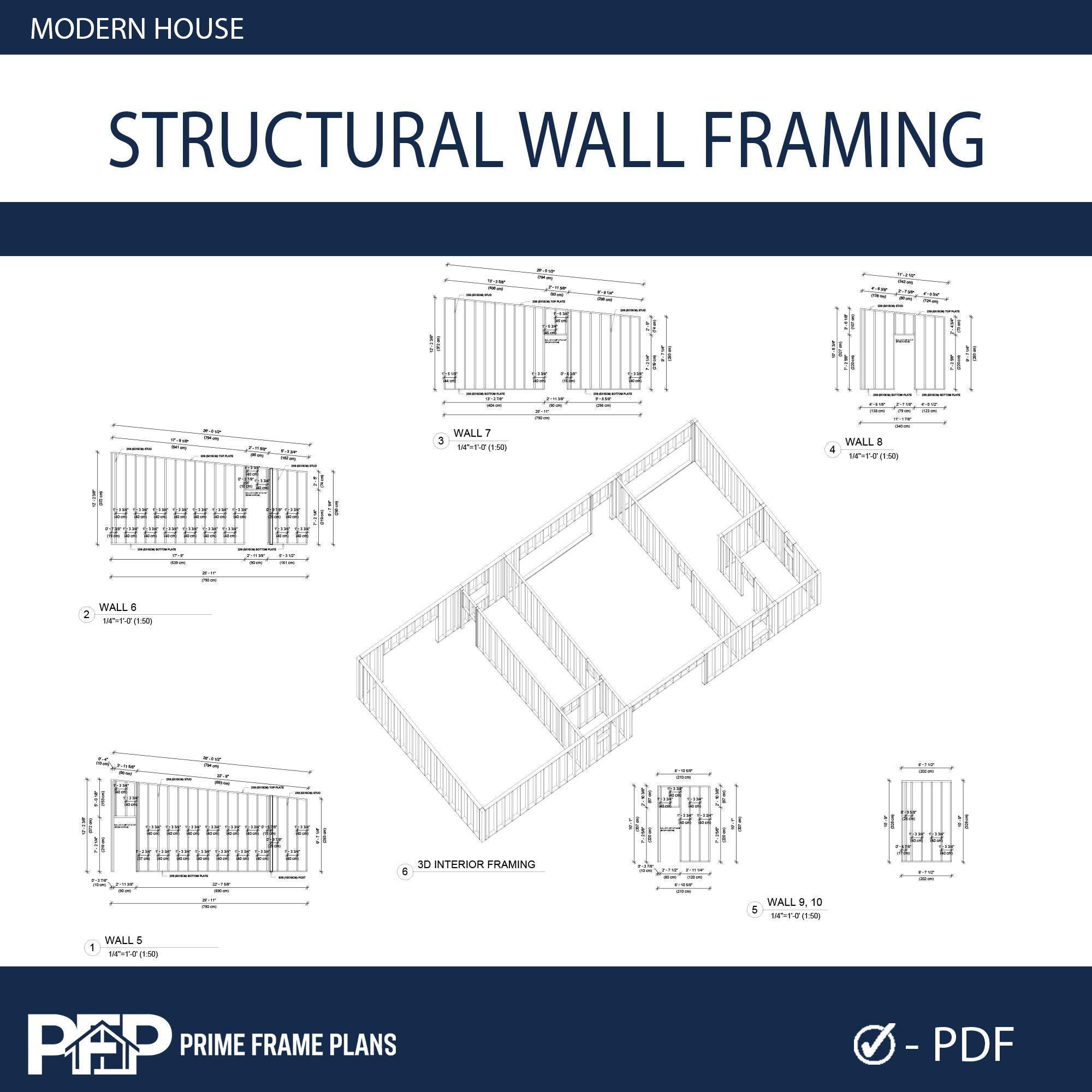 COMPLETE PDF PLAN SET (9 SHEETS): • Cover Sheet (A1.1): Project data, disclaimer, and sheet index. • 3D Views & Diagrams (A1.2): Exterior perspective views and exploded structural assembly diagram. • Architectural Floor Plan (A1.3): Detailed floor layout with room dimensions and general notes. • Technical Plans (A1.4): Conceptual foundation plan, roof plan, and electrical lighting layout. • Exterior Elevations (A1.5): North, South, East, and West views with material finishes. • Building Sections (A1.6): Cross-sections (A-A, B-B, C-C) showing vertical heights and assembly details. • Wall Framing Elevations (A1.7): Exterior wall stud layouts and 3D framing views. • Partition Framing Plans (A1.8): Interior wall framing details and 3D interior structure view. • Details & Schedules (A1.9): Window/Door schedules and specific construction details.