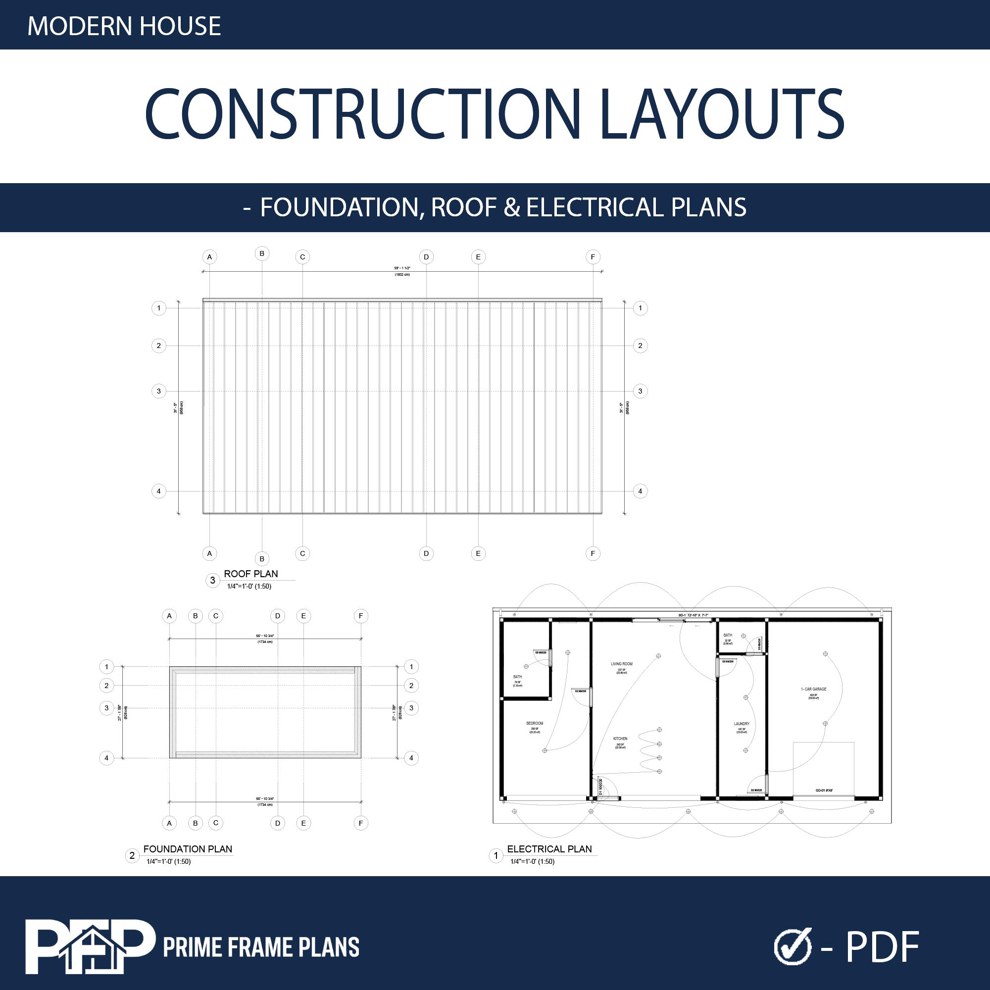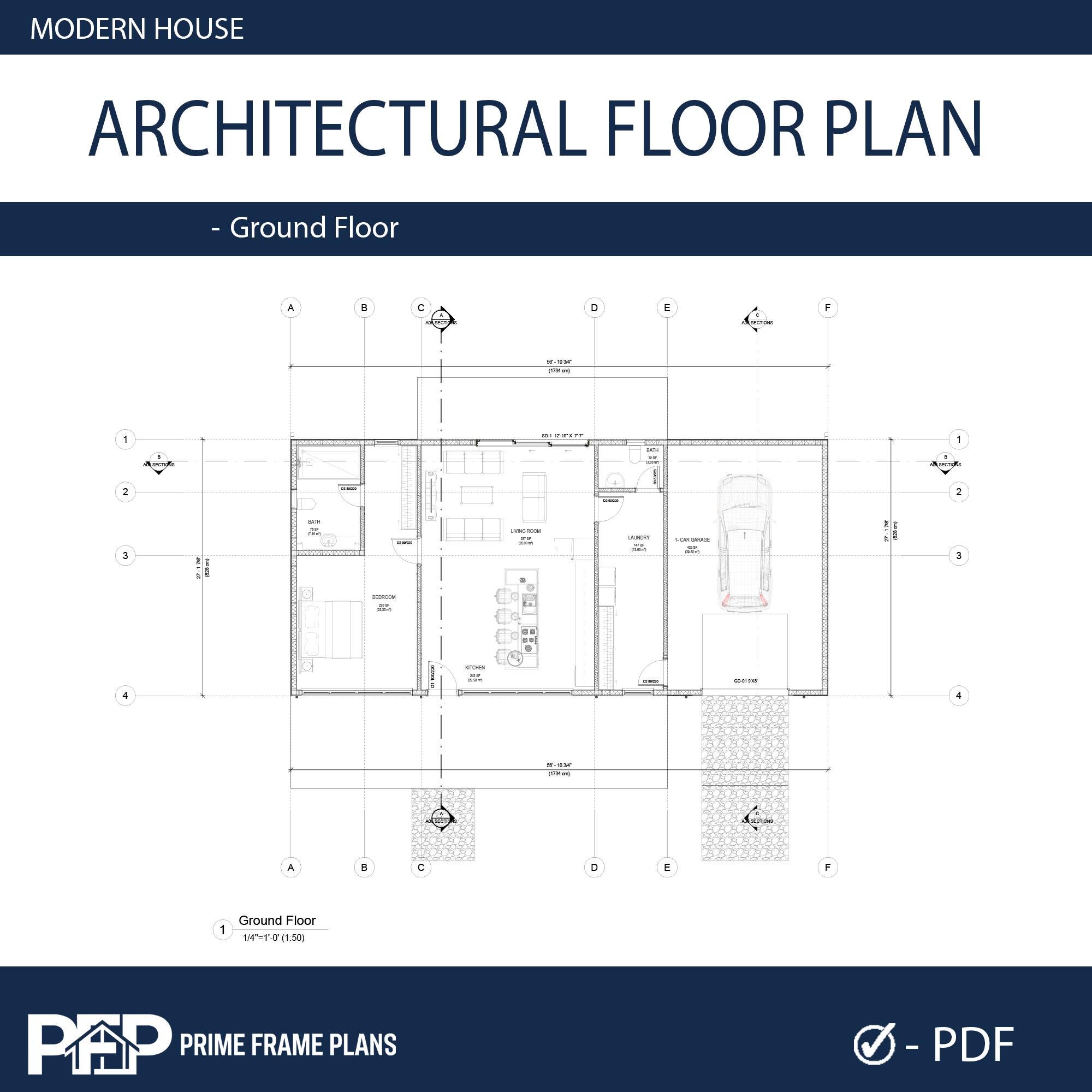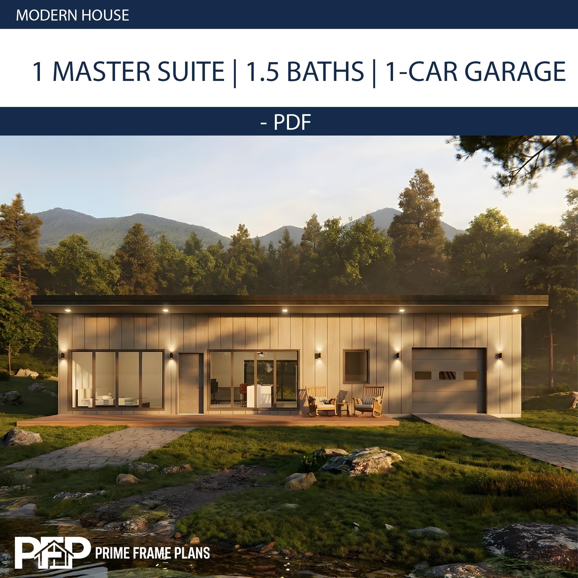 PRIME FRAME PLANS presents: The Modern House Project. Defined by clean lines and functional elegance, this single-story modern home is designed for contemporary living. Featuring a spacious open-concept living area with floor-to-ceiling windows, a luxurious master suite, and an integrated 1-car garage, this plan offers the perfect balance of style and practicality. Ideal for a primary residence, a sophisticated guest house, or a high-end rental property.
