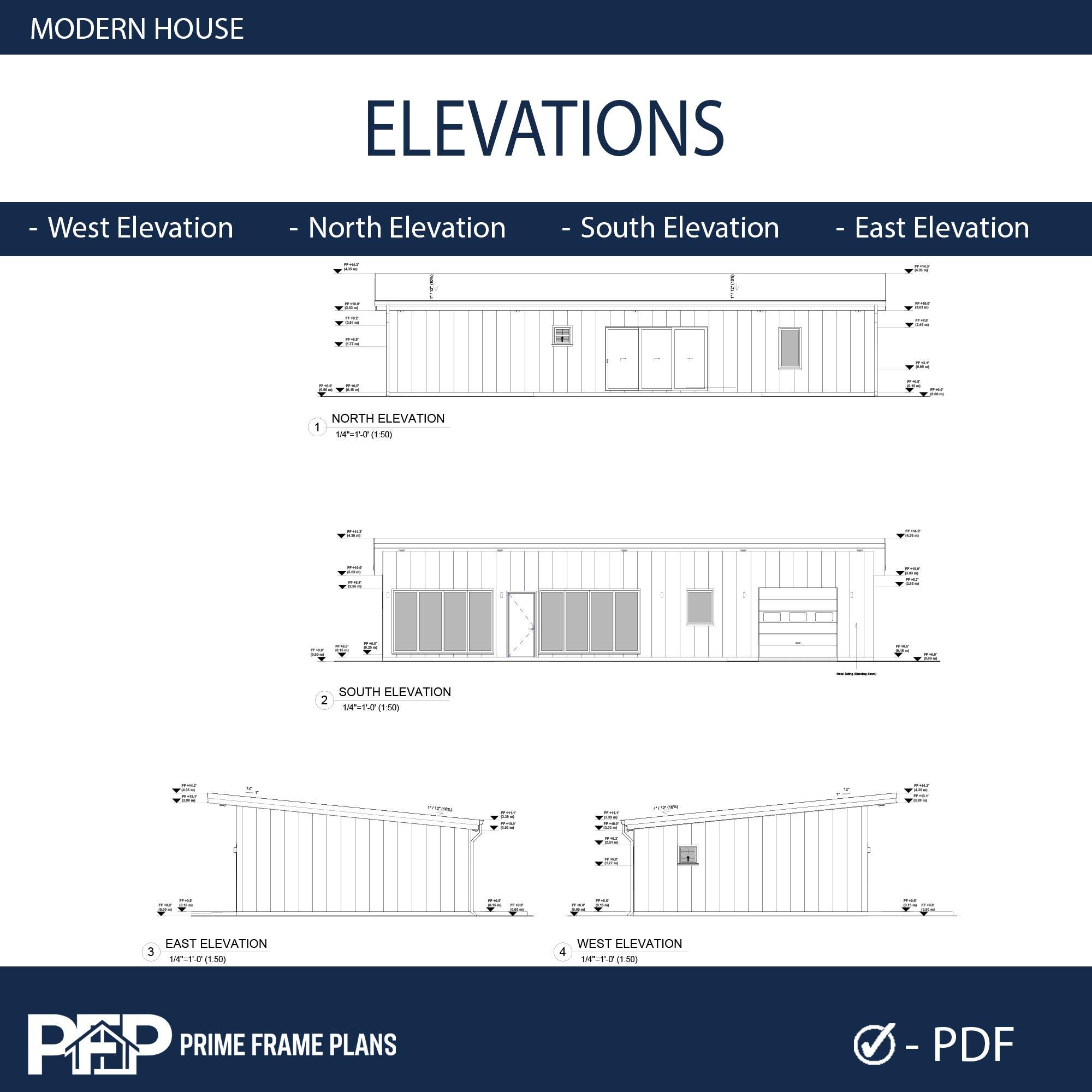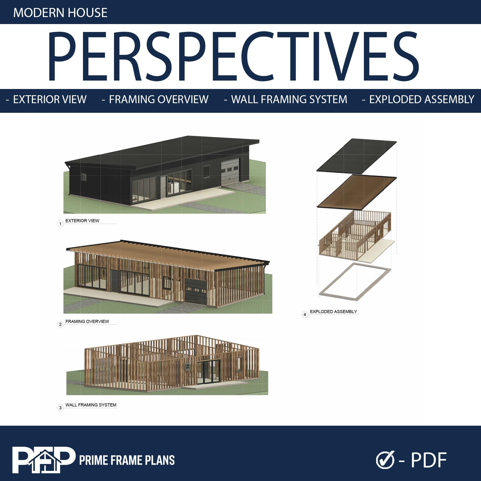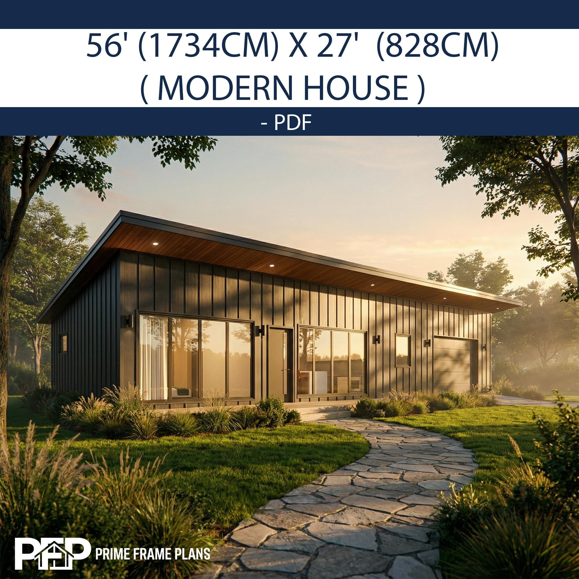 PRIME FRAME PLANS presents: The Modern House Project. Defined by clean lines and functional elegance, this single-story modern home is designed for contemporary living. Featuring a spacious open-concept living area with floor-to-ceiling windows, a luxurious master suite, and an integrated 1-car garage, this plan offers the perfect balance of style and practicality. Ideal for a primary residence, a sophisticated guest house, or a high-end rental property.