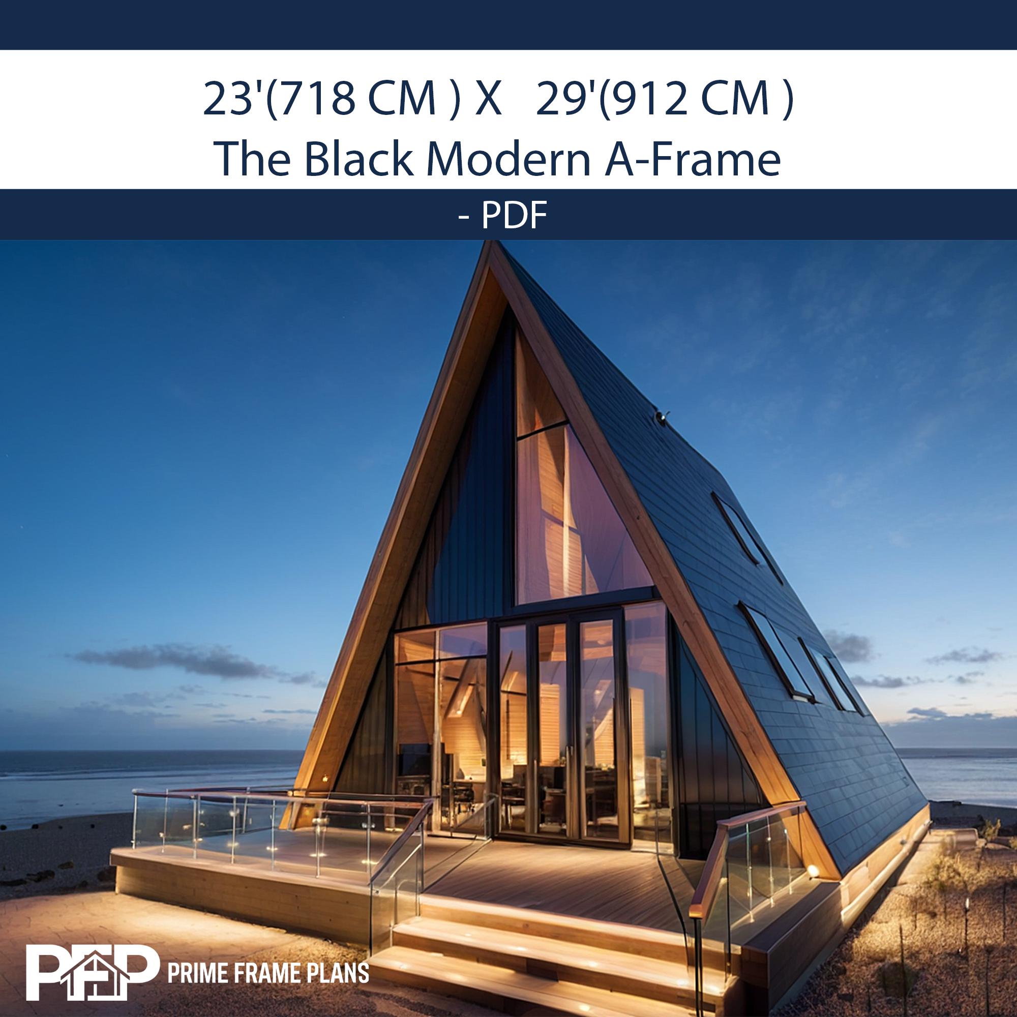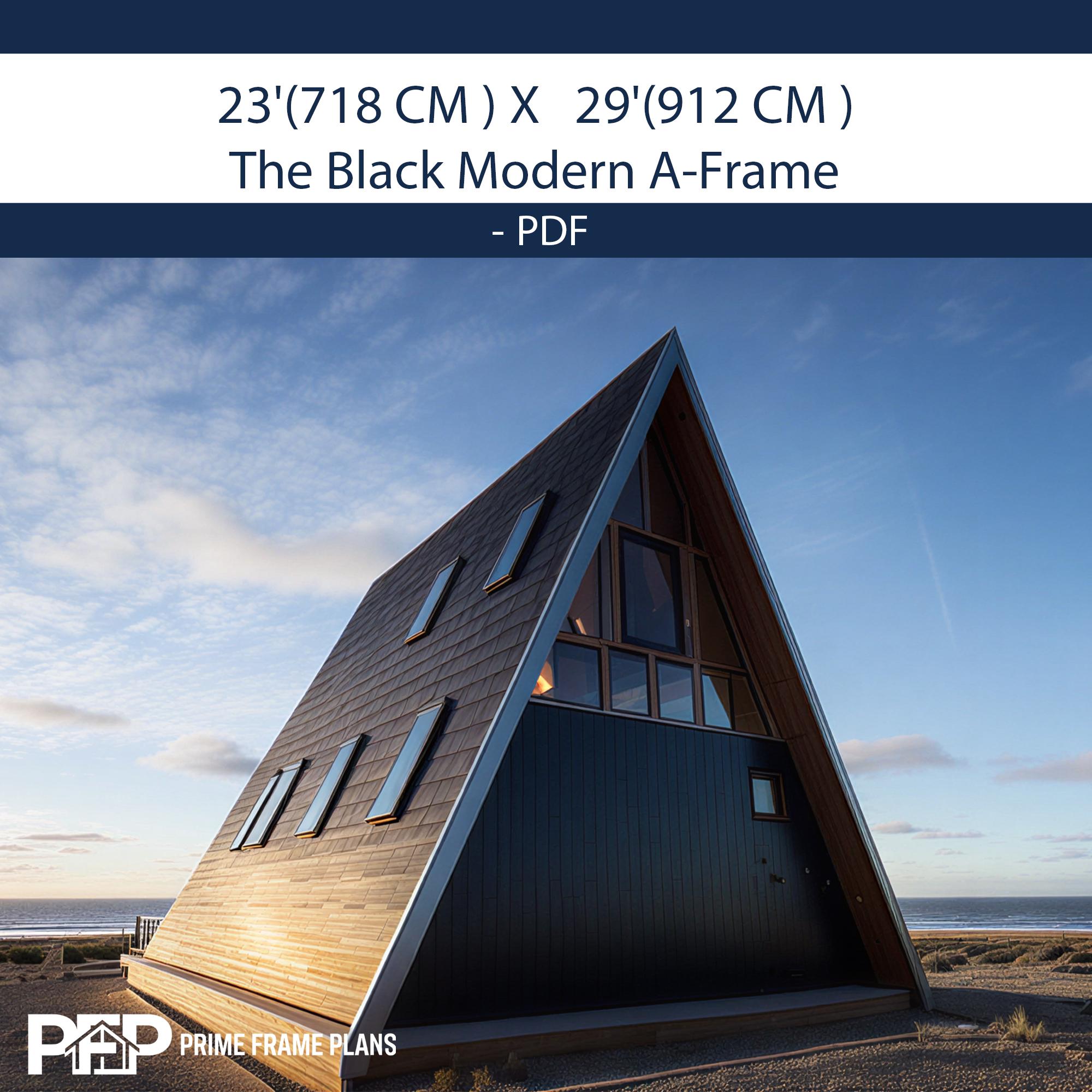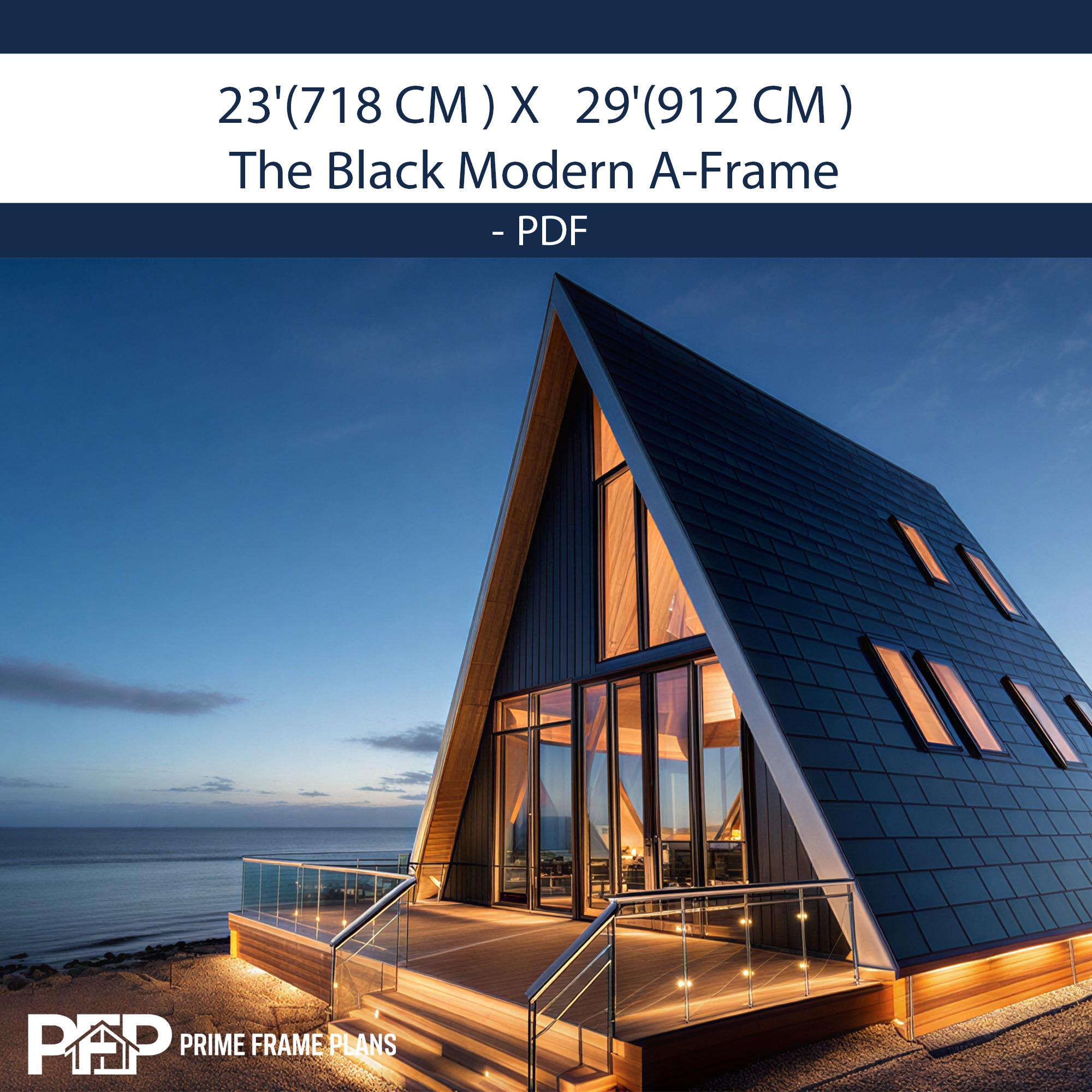 PRIME FRAME PLANS presents: The Black Modern A-Frame. The Black Modern A-Frame is a striking architectural cabin designed for contemporary living in harmony with nature. Featuring a bold dark exterior and an expansive glass gable facade, this design maximizes natural light and scenic views. Perfect as a vacation getaway or a stylish tiny home, it seamlessly blends Nordic minimalism with functional elegance.