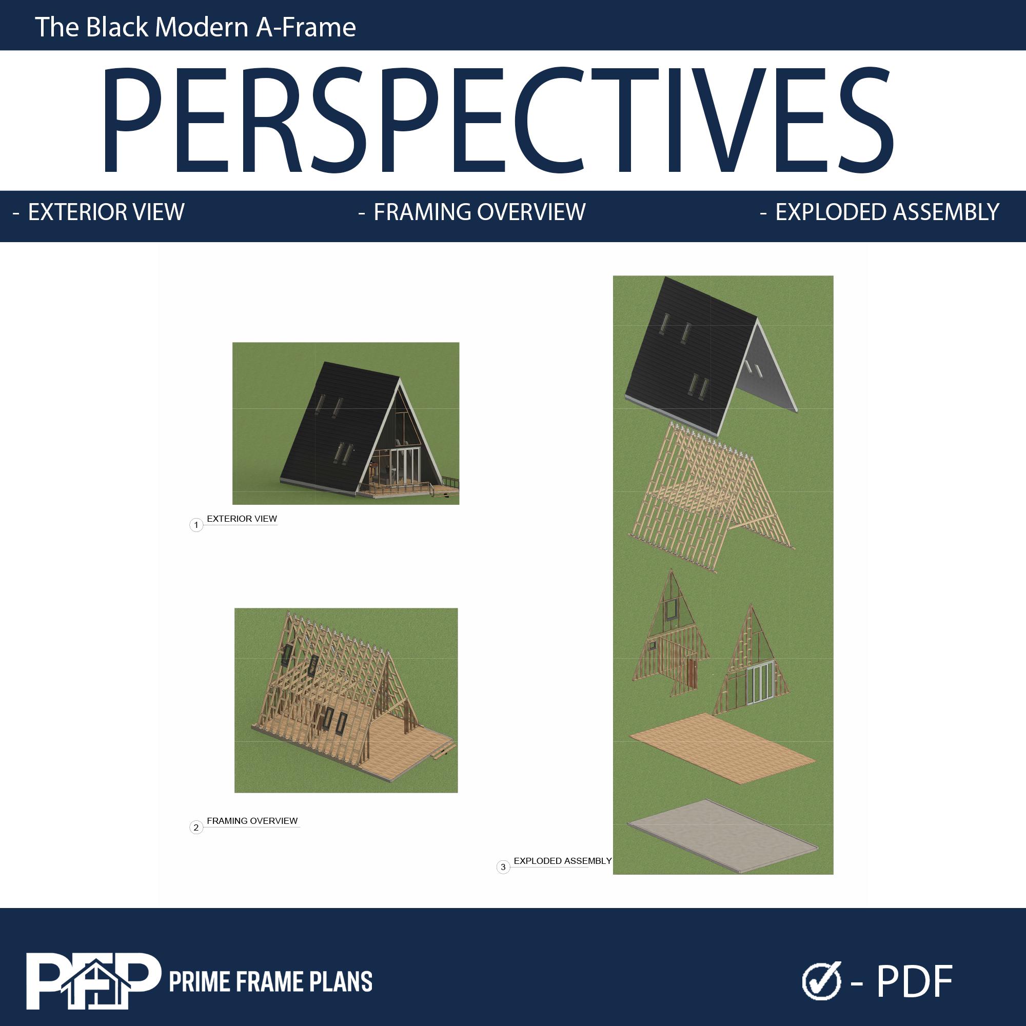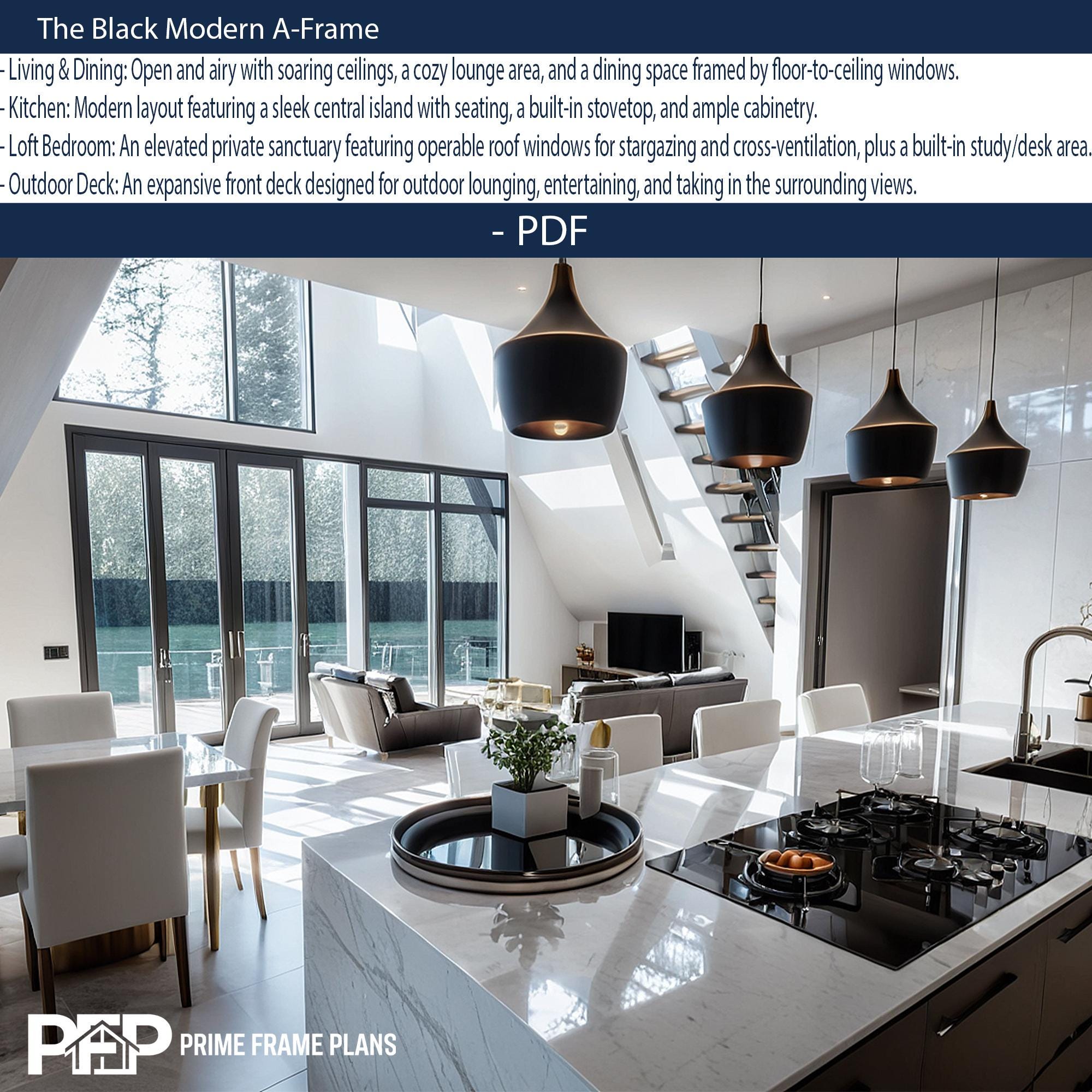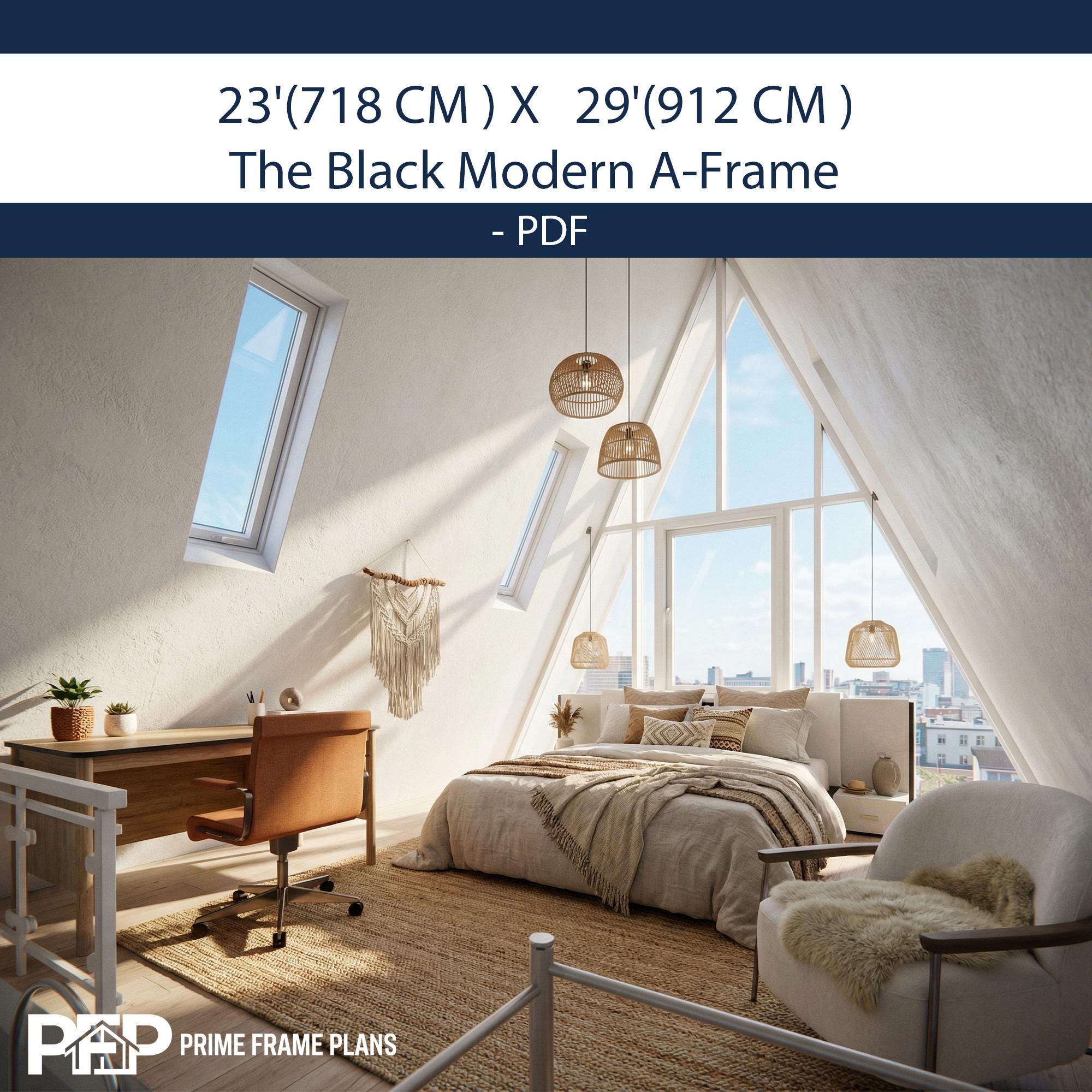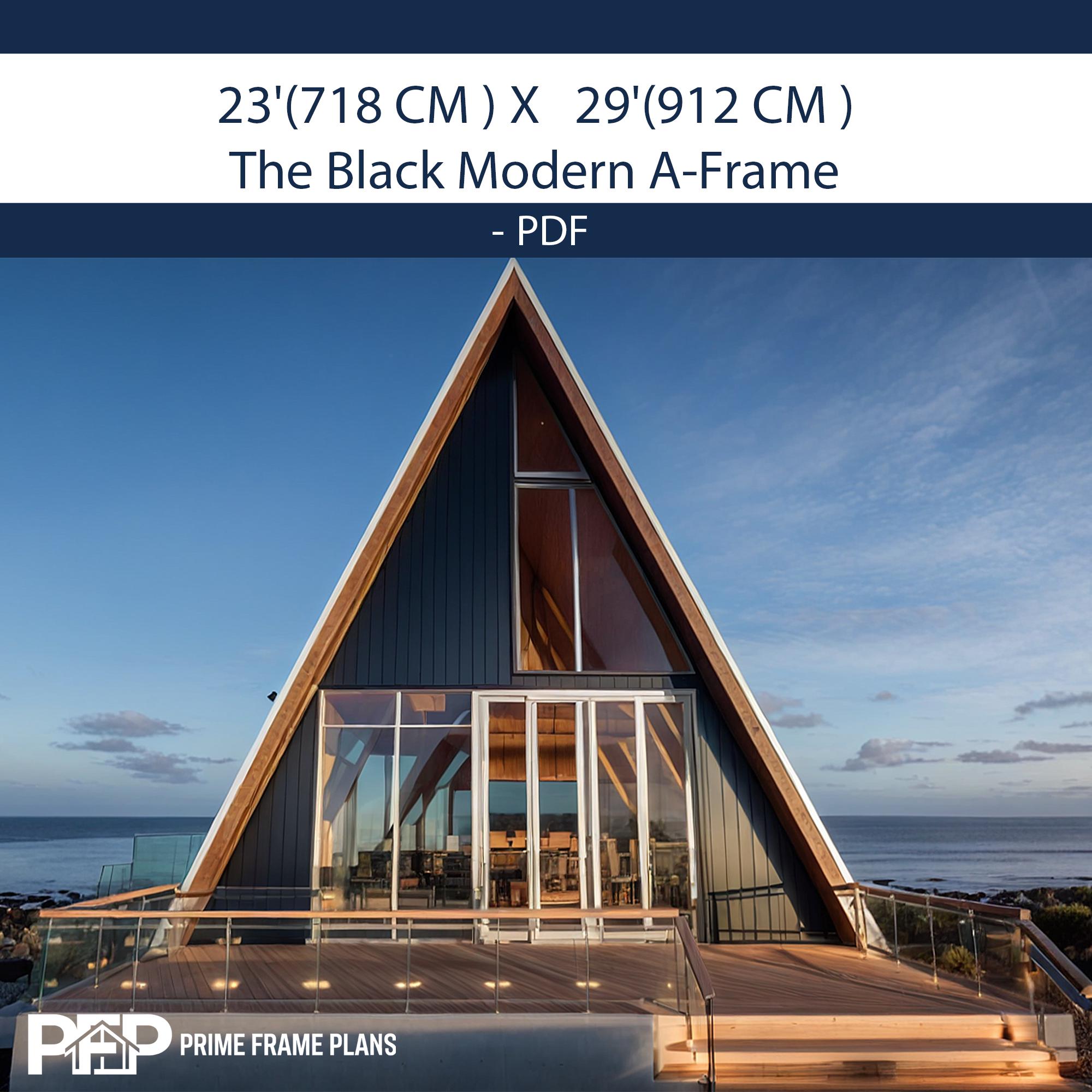 PRIME FRAME PLANS presents: The Black Modern A-Frame. The Black Modern A-Frame is a striking architectural cabin designed for contemporary living in harmony with nature. Featuring a bold dark exterior and an expansive glass gable facade, this design maximizes natural light and scenic views. Perfect as a vacation getaway or a stylish tiny home, it seamlessly blends Nordic minimalism with functional elegance.