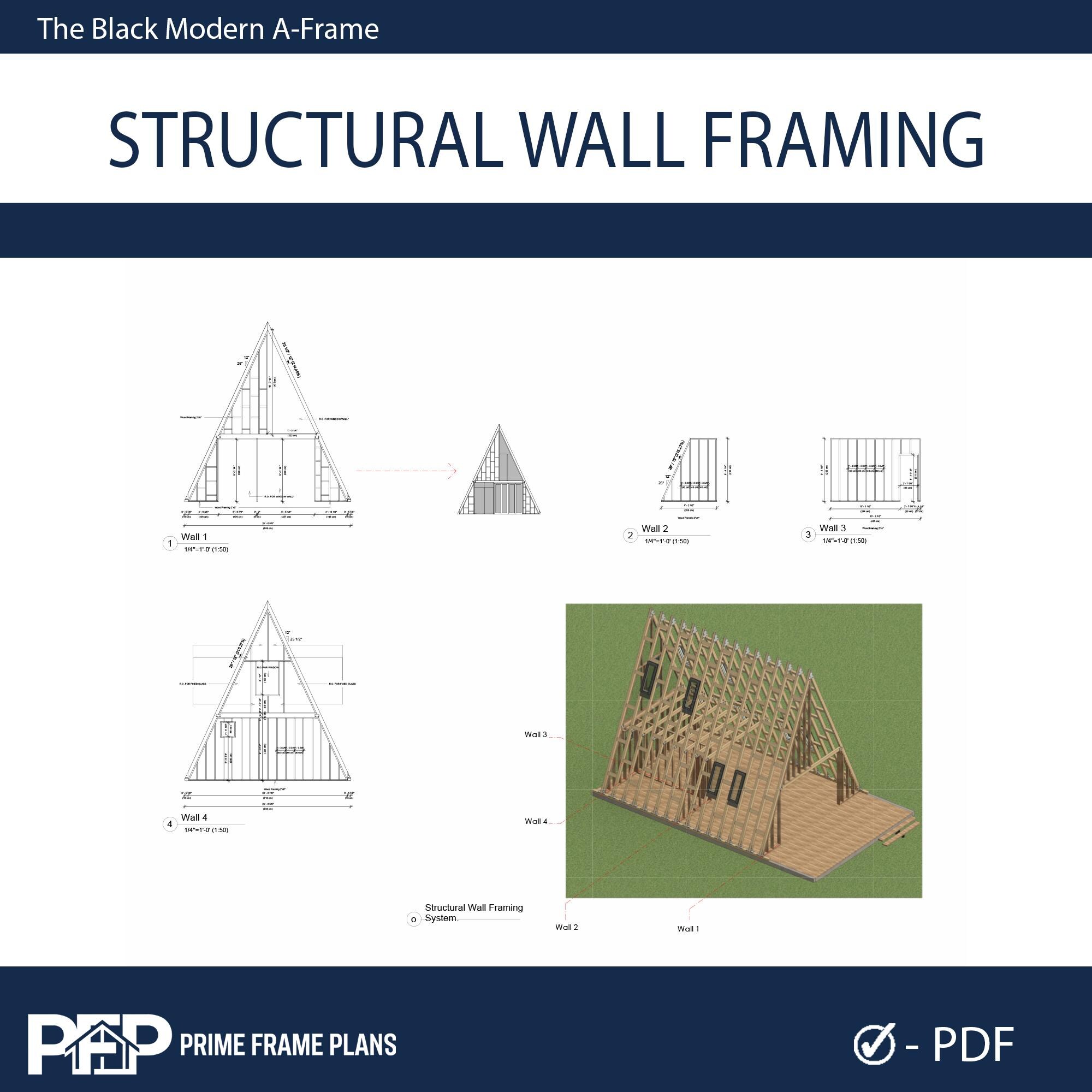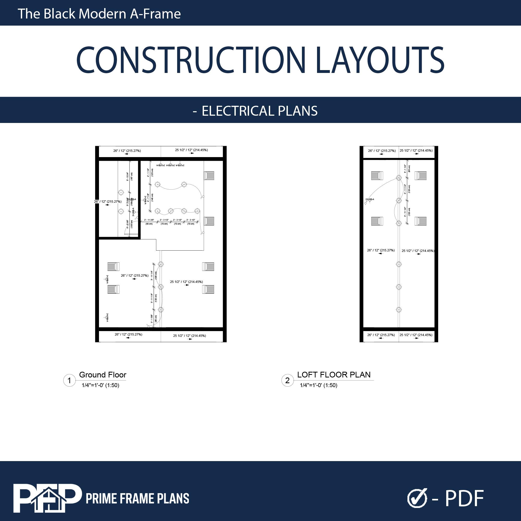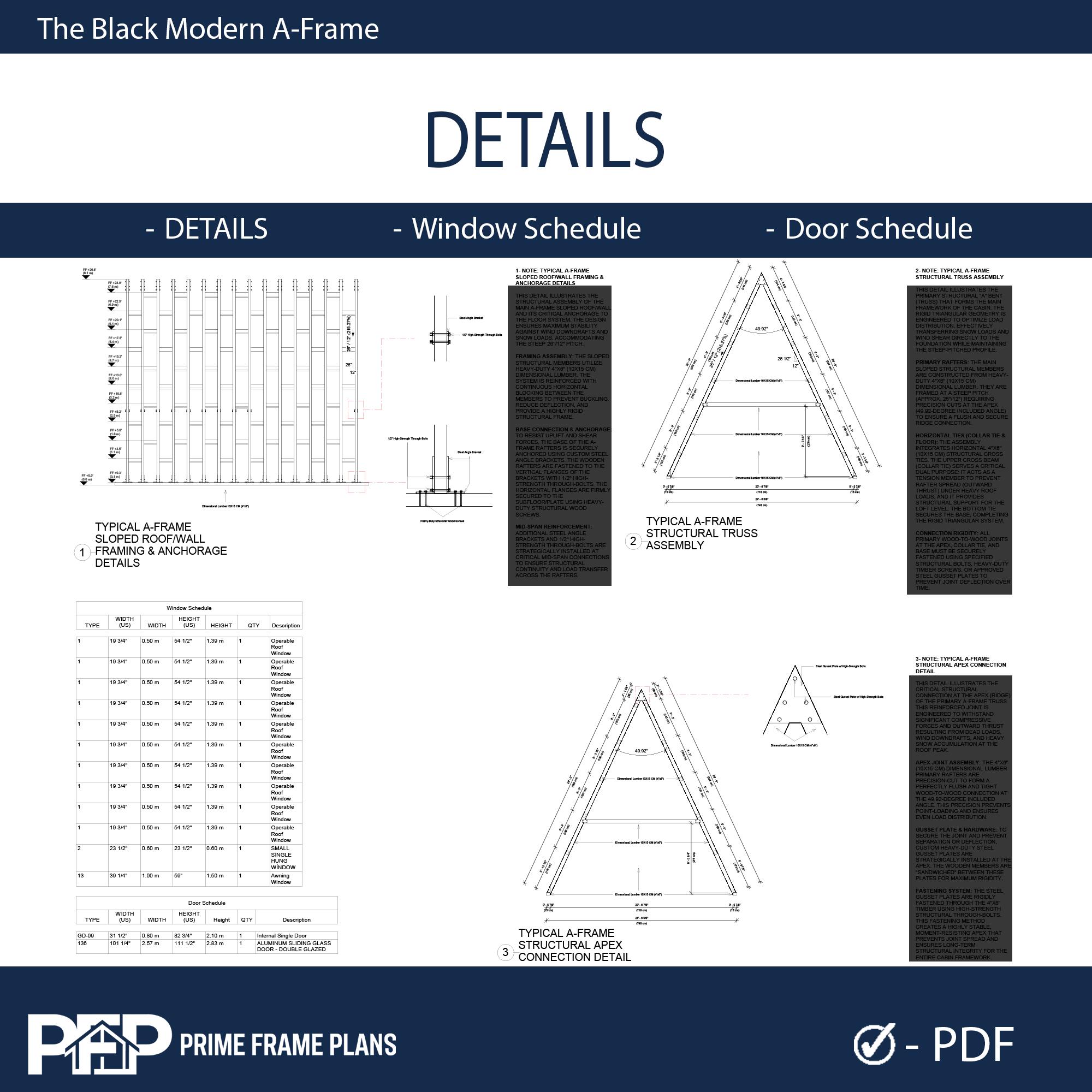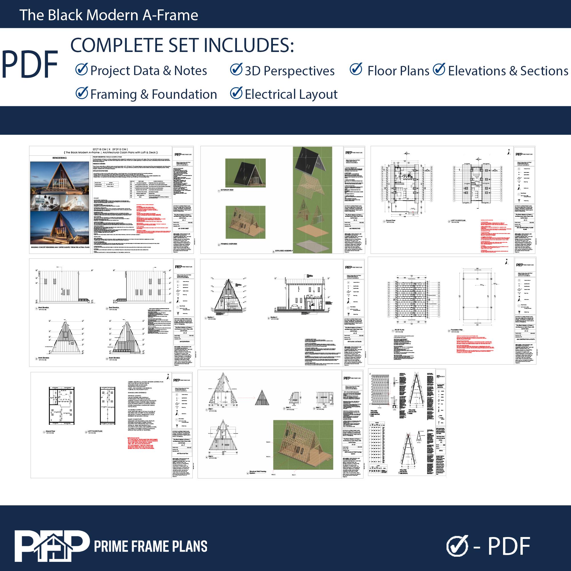 COMPLETE PDF PLAN SET (9 SHEETS): • A01 - Cover Sheet & Project Data: Project Data, Sheet Index, Legal Disclaimers. • A02 - 3D Perspectives & Exploded Views: 3D Perspective Views, Exploded Assembly Diagram. • A03 - Architectural Floor Plans: Floor Plan, Loft Floor Plan, Room Dimensions, General Notes. • A04 - Exterior Building Elevations: North, South, East, and West Elevations. • A05 - Building & Wall Sections: Cross Sections, Wall Assembly Details. • A06 - Construction Layouts: Roof Details & Foundation layout. • A07 - Electrical & Lighting Layout: Electrical Plans. • A08 - Wall Framing Plans: Structural Wall Framing System. • A09 - Details: Typical A-Frame Sloped Roof Wall Framing & Anchorage Details.