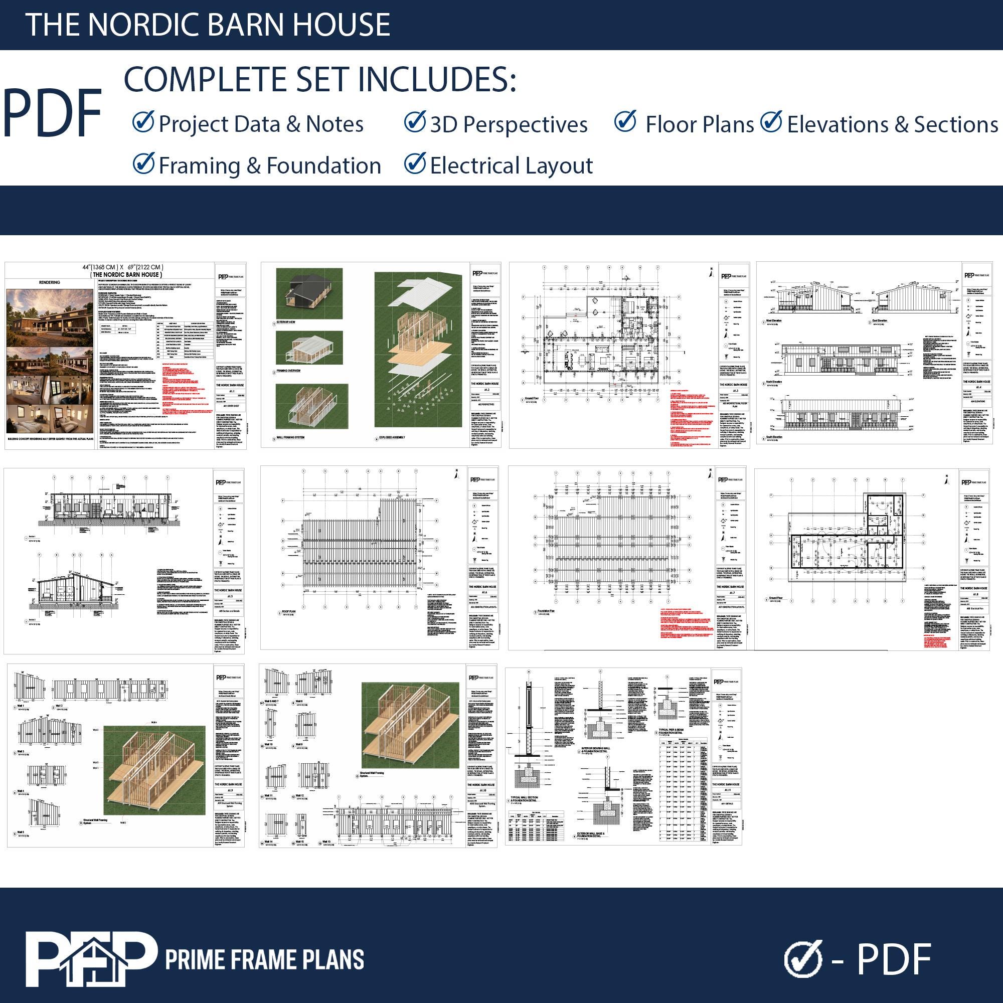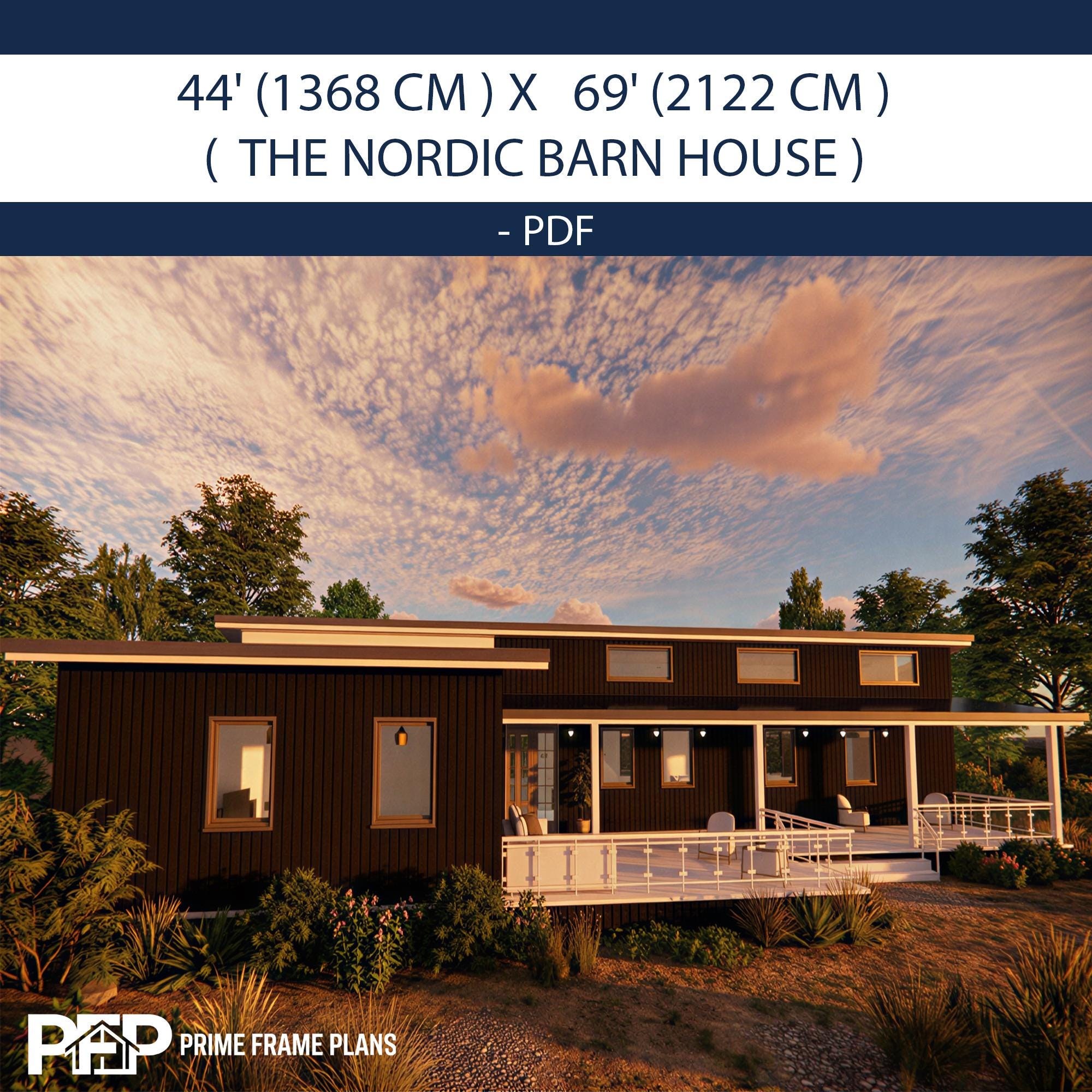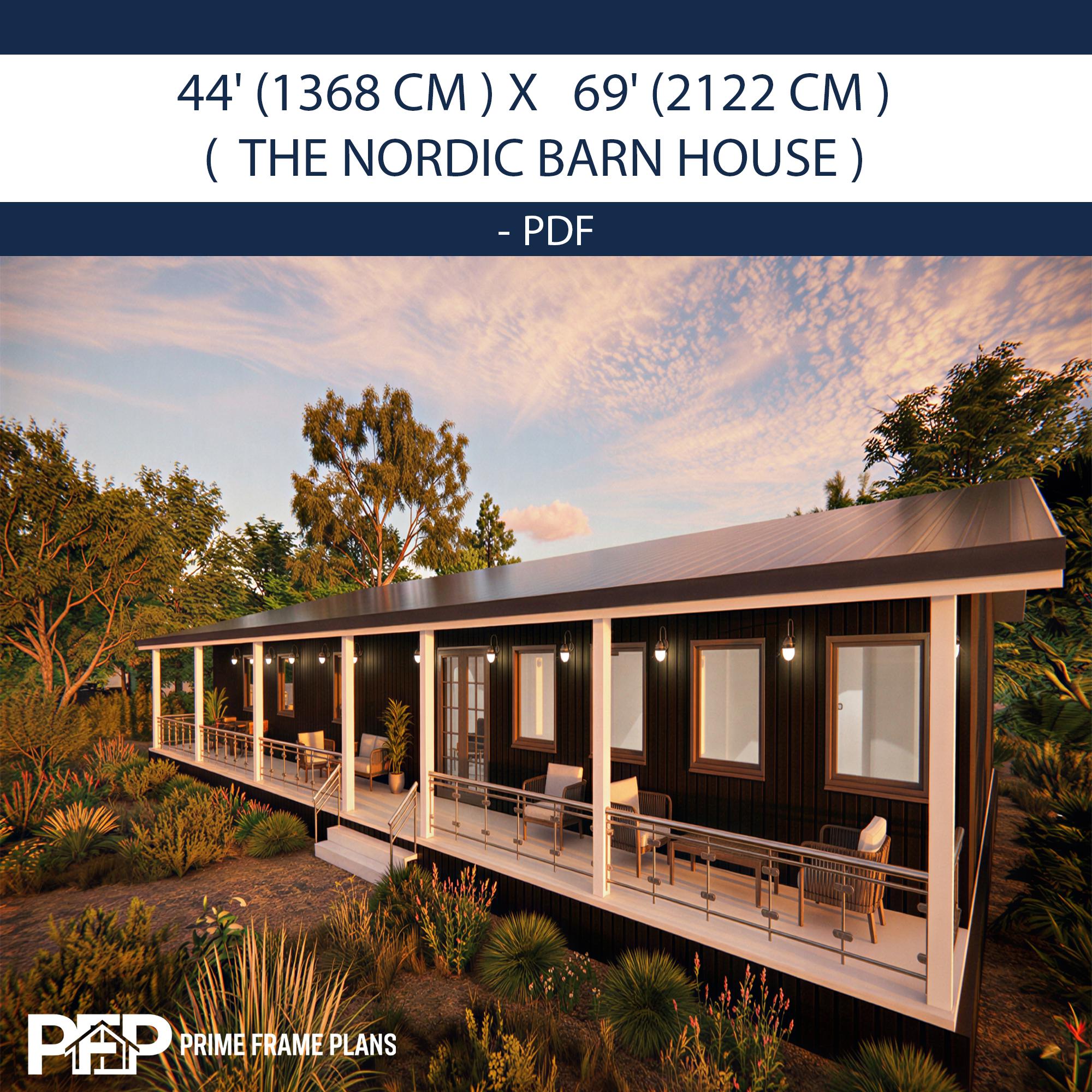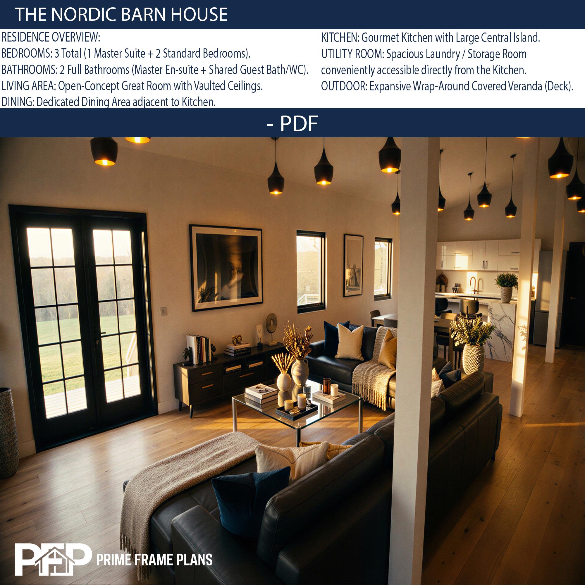 PRIME FRAME PLANS presents: The Nordic Barn House. Inspired by Scandinavian minimalism, this modern barn-style residence offers a perfect blend of luxury and functionality. The design is characterized by its striking shed roof profile, black vertical siding, and an expansive wrap-around veranda that promotes seamless indoor-outdoor living. Inside, you'll find a massive open-concept great room with vaulted ceilings, a gourmet kitchen with a central island, and a private master suite wing. This plan is the ultimate blueprint for a stylish family home or a high-end vacation rental.